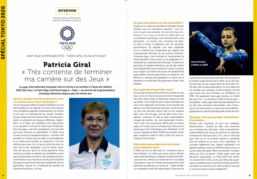 Cet article du Gym Mag et sa dernière interview sur TLC, vous apprendront qu’elle met un terme à sa carrière de juge internationale. Mais ne vous y trompez pas, jamais sa passion ne faiblira. Elle continuera à œuvrer pour la gymnastique locale, départementale, régionale et nationale…